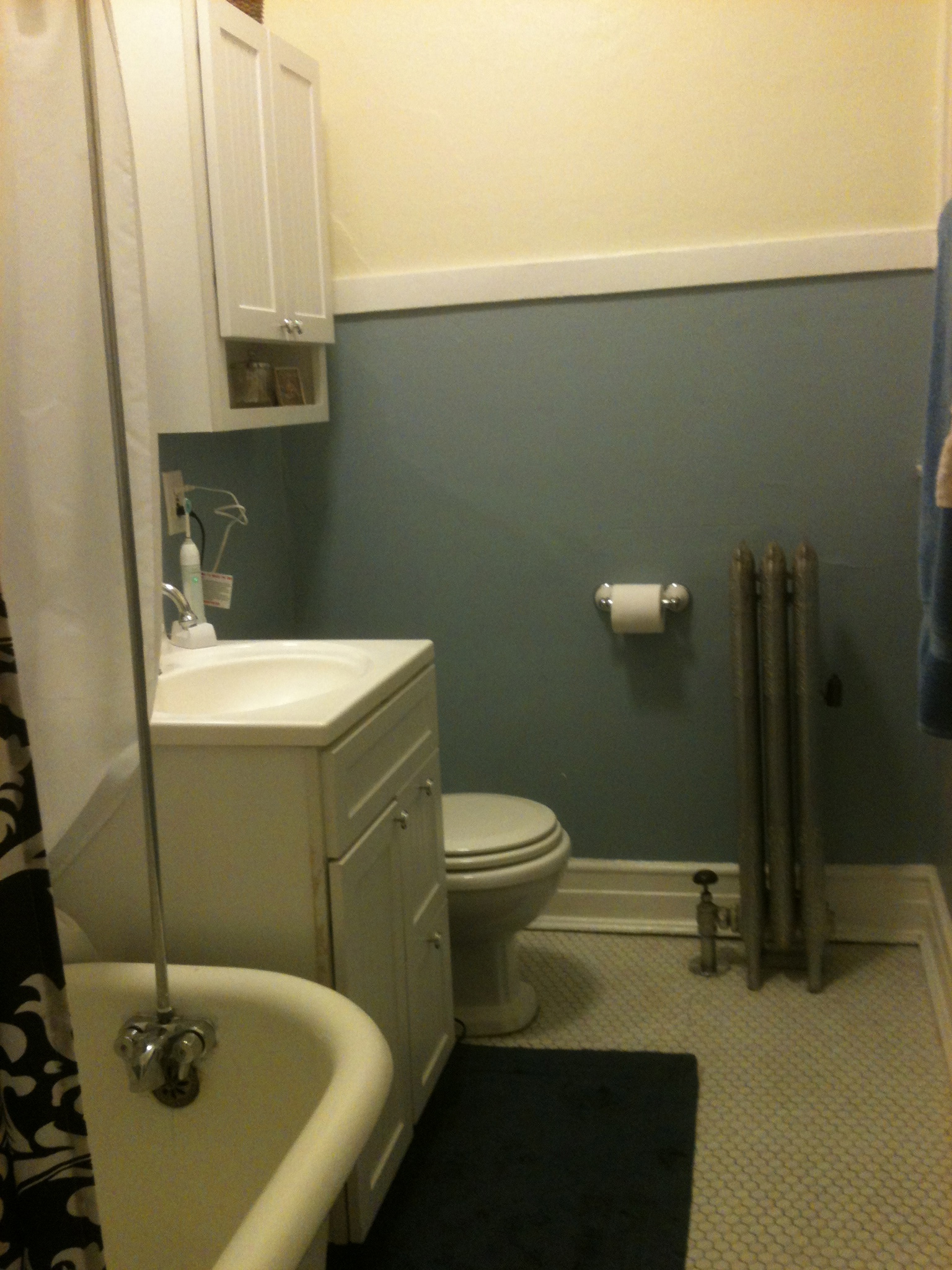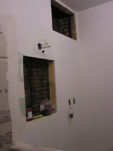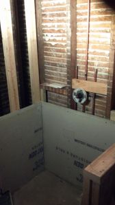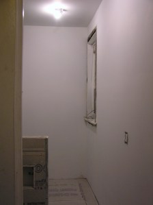 - That hole above the medicine cabinet (in the last picture)? There’s random empty space in the wall about 7 feet up, above the top of the coat closet on the other side of the wall. Its going to be a bonus cabinet. Stay tuned!