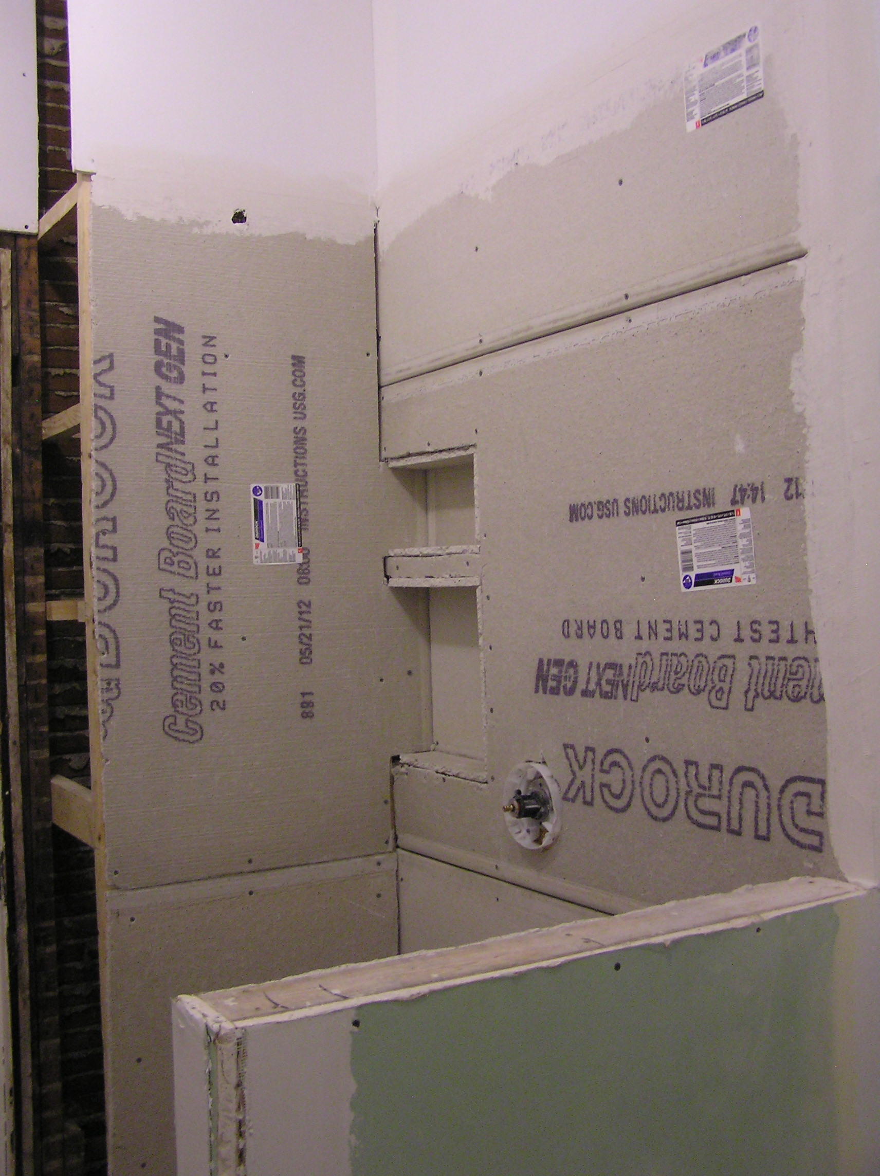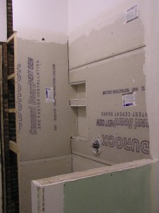 While I was gone, they made some (ahem, not enough) progress (this is the shower, where the tub used to be):
