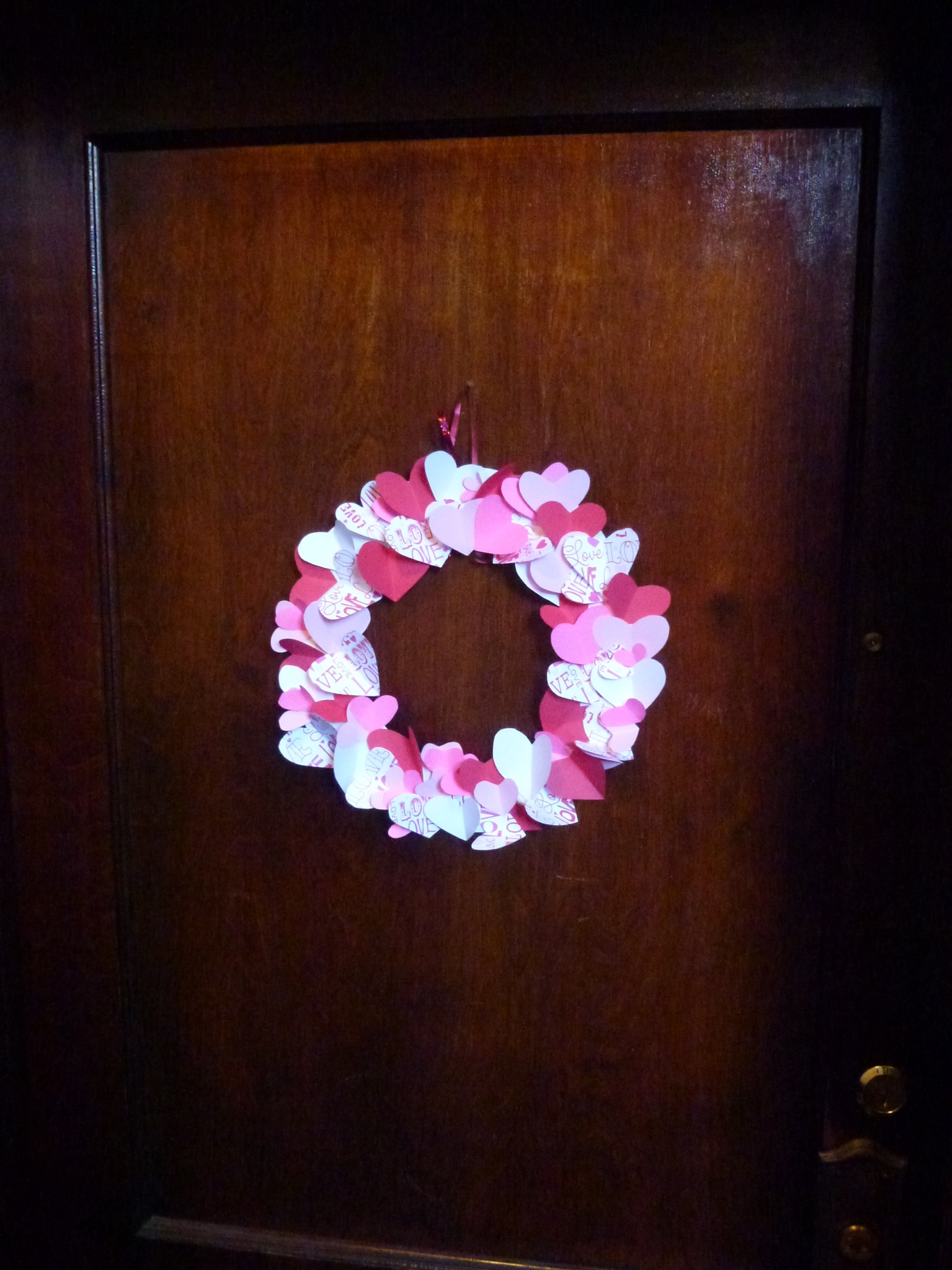 I wanted a little something for my door and a wreath seemed like a fun choice. No real instructions–I used five different coordinating papers, one of which was patterned with the word love and then cut strips between 2-4.5″ and then folded them in half. Then I free hand cut out a bunch of hearts.