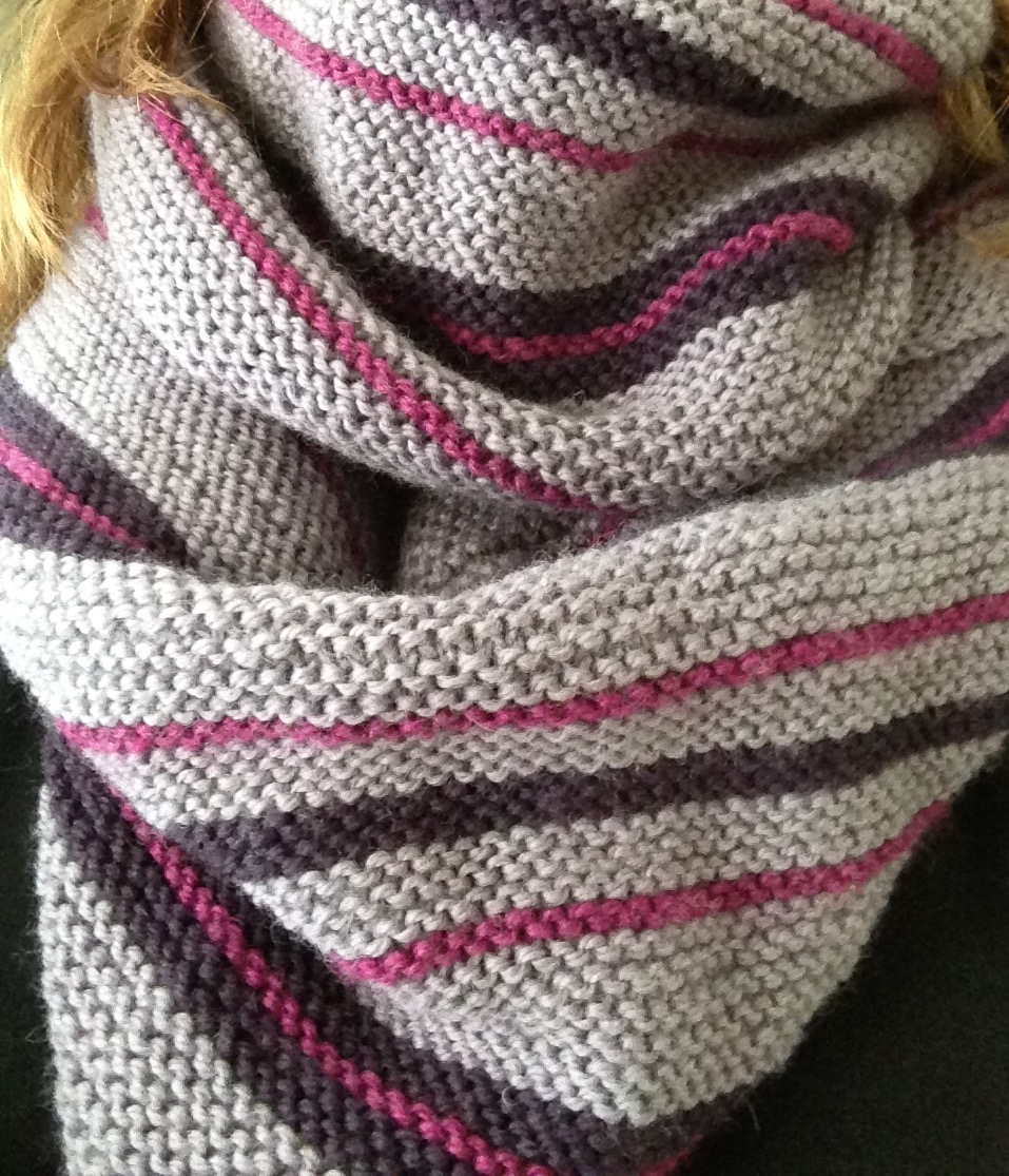 I loved the cosiness of the stockinette stitch for that piece, and set out to make an even thicker scarf from the leftovers (I had about a skein and a half of the lavender, and half a skein each plum and eggplant). I knit the entire piece with two strands together, randomly switching between which two colors were together every few rows. With the thickness of two strands, plus the naturally cushy nature of stockinette, I wound up with a fantastically thick, warm scarf. (Not sure what’s up with the colors in the next two photos — in real life the photo above is the closest to reality.)