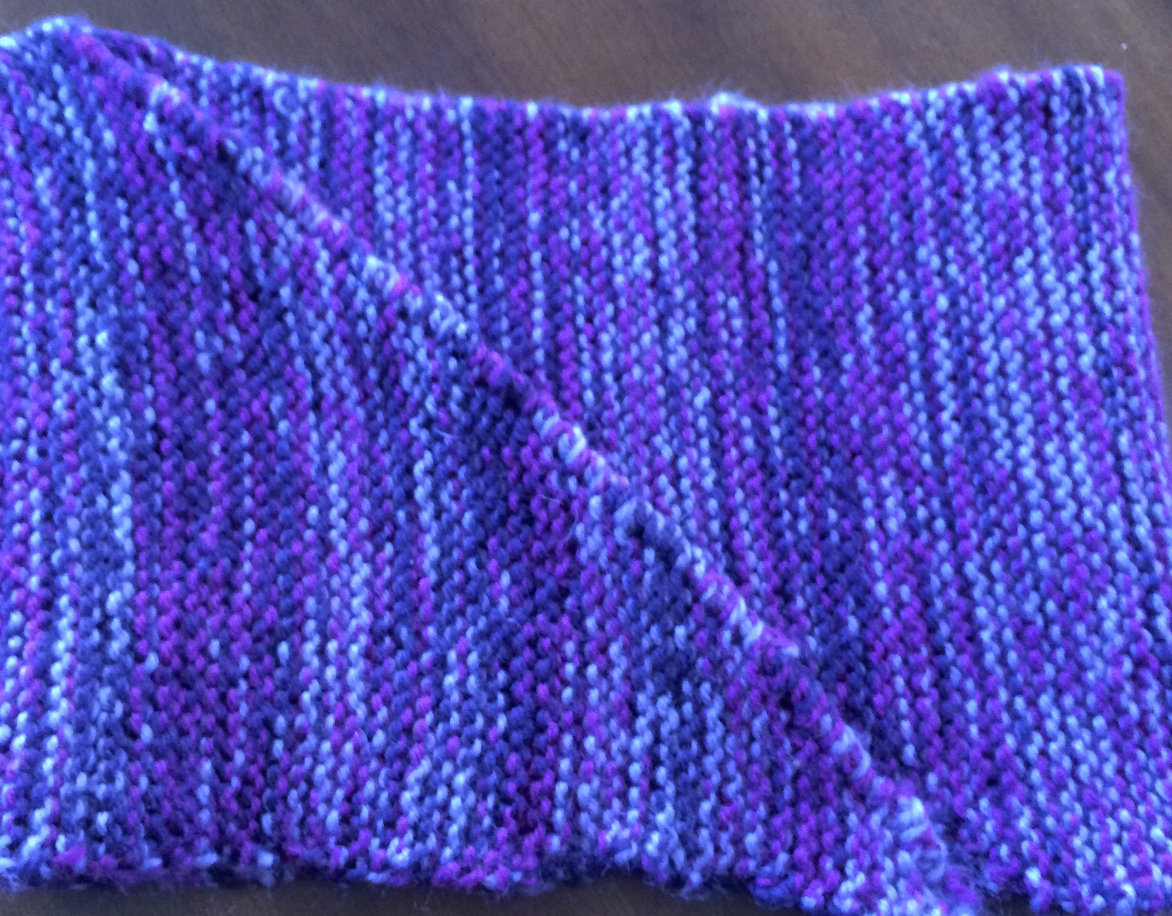Except I ran out of yarn and it was way, way too short. I’d done very steeply angled ends, so I turned it into a small, sturdy cowl with an “intentional” diagonal seam as a feature.