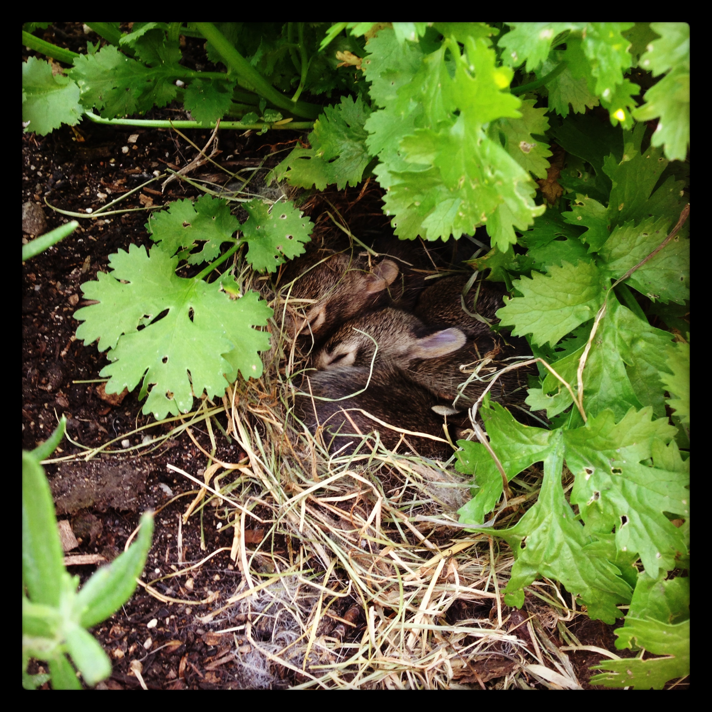 A bunny decided to have her babies in our herb garden, right under the parsley. It wasn’t really an ideal site for a bunny family: The herbs and lettuce hadn’t really grown in yet, so the nest seemed very exposed to us. Not to mention the fact that Bronwen-the-dog is out there all the time. And my neighbors’ cat, who is a known threat to wildlife (we’ll just refer to the proof as the Chipmunk Massacre of 2011 and leave it at that).
