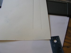Measure the dimensions along two edges. If you use a paper cutter, you won’t need to extend the lines. Cut MOST (but not all) of the way across, so you have a fringe.