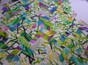 6.   Once you decide on your pieces (I did 1×3), measure out on the backs where to cut. Set aside any that you will not want uniform pieces of—basically anything that was a thing (like a tree) and not abstract.