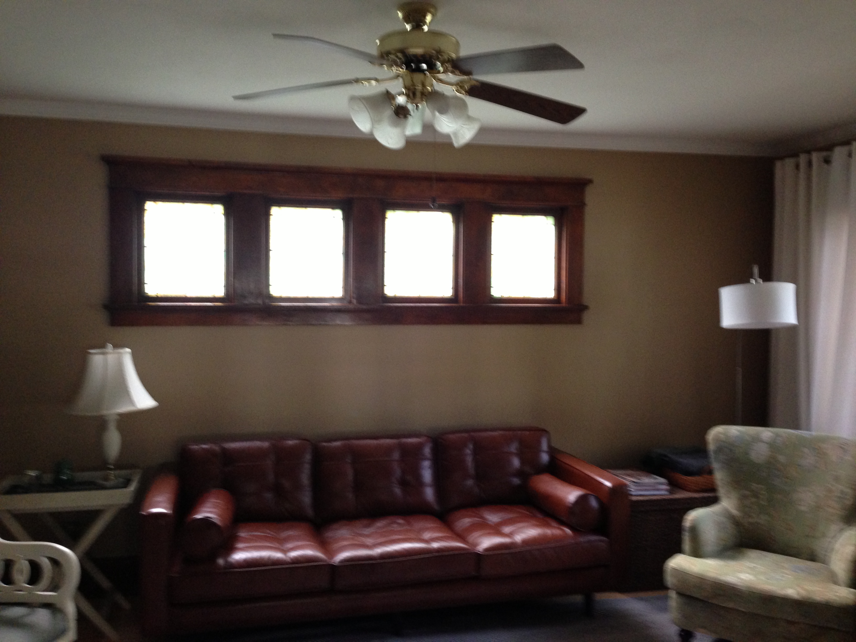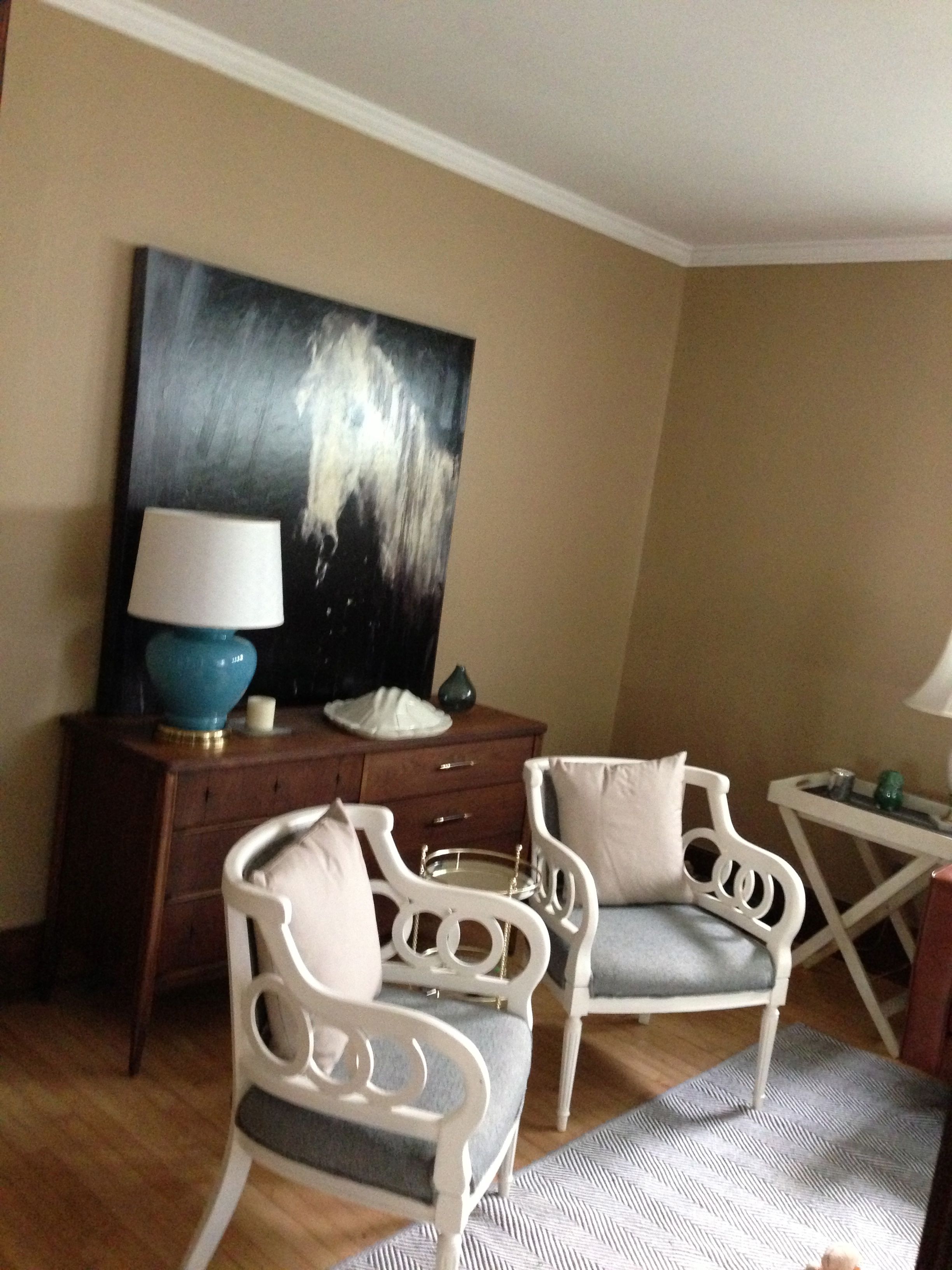 A dark room with sage green walls with a nice dented texture that you can see on the left. Since I was sticking with light gray for most of the rest of the apartment (Burnished metal in the foyer, dining room and back hall and French Silver in the bedroom), and this was one of the few rooms that was open, but separated from the other rooms by wood trim (the halls, kitchen and dining room all flow together with plaster archways), I thought it was an opportunity to add another color to the house. I know some people like to use one continuous color when rooms are open to each other, but I really like the effect of looking from one room to another and seeing a touch of something different – as long as it works together! (My disastrous interim kitchen color did not, which is a story for another blog entry.) With all the wood accents throughout the apartment, I thought brown would work really well and would make the room feel warm and snug. I’d planned to get a light gray couch, a gray patterned rug, a light-colored ottoman coffee table, and then I was finally going to recover those estate sale chairs in a light/neutral fabric and paint them white.