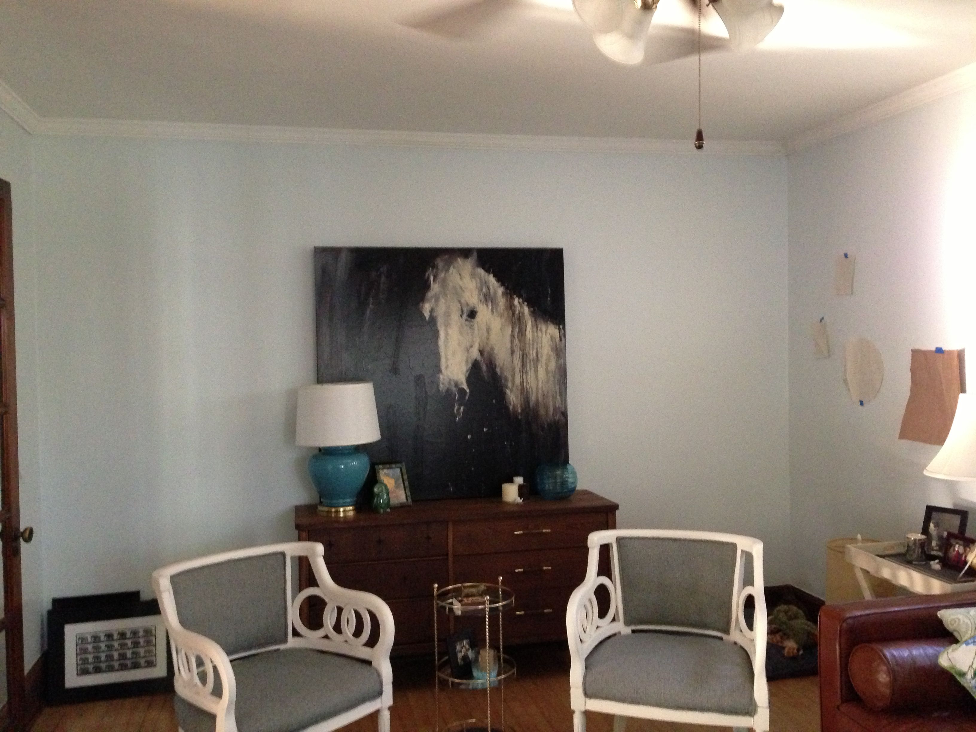 Hanging art on the walls made a huge difference in making the living room feel cozier after I repainted it a light icy blue.