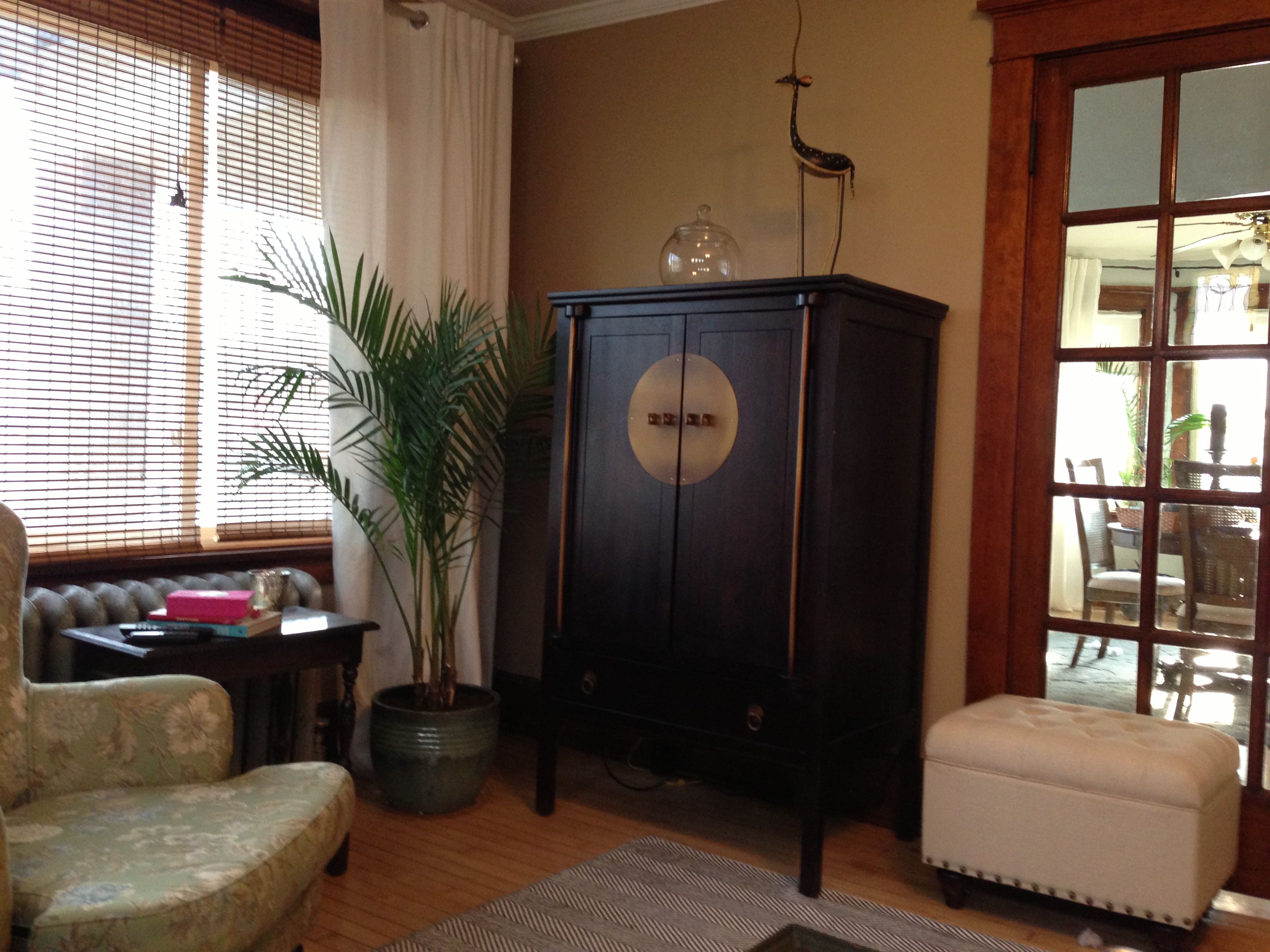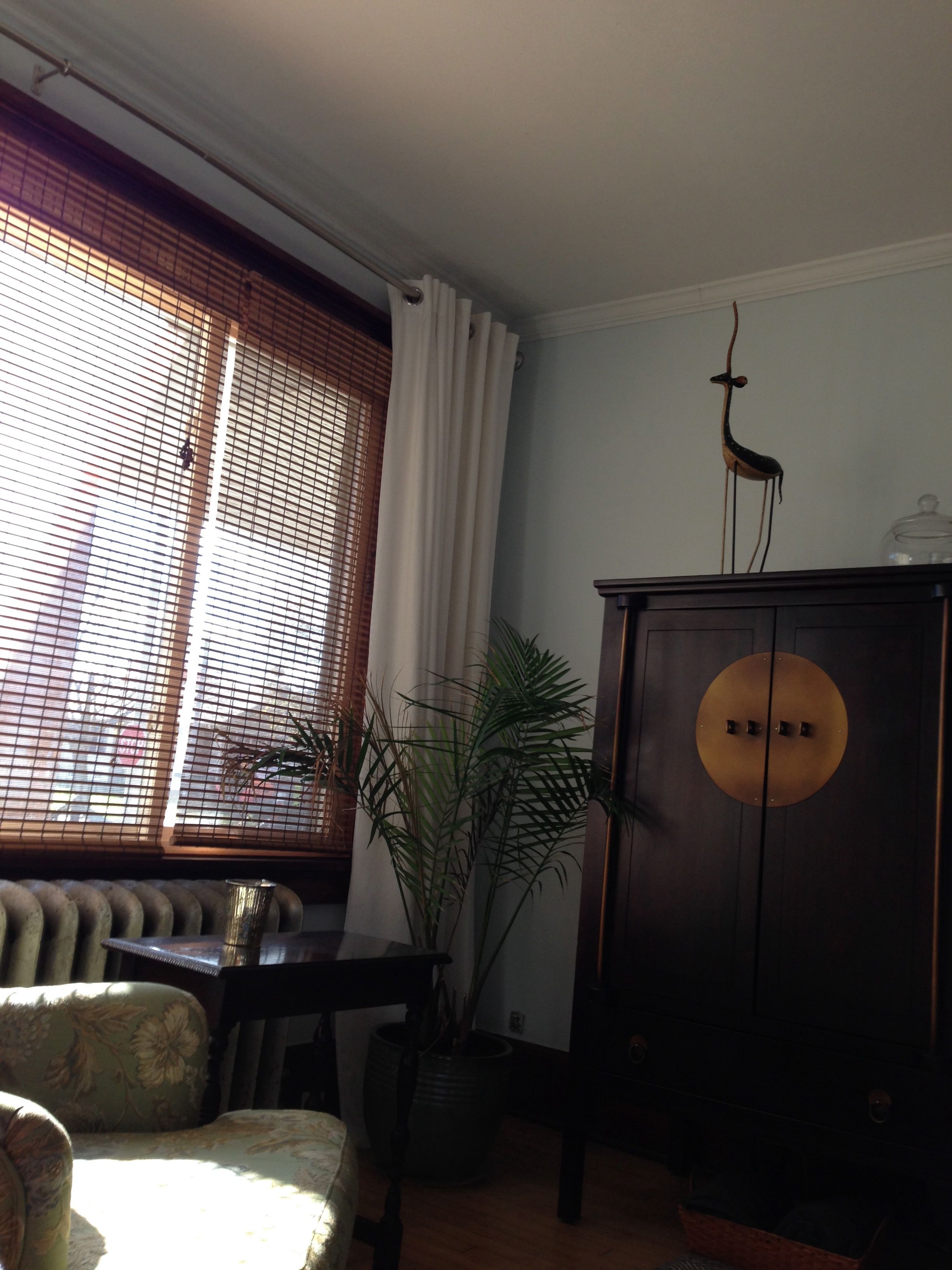 There were light-colored curtains, and the light rug, and the cream ottoman and light-green chair. I even had a plant. The whole brown-on-brown-on-brown thing wasn’t bugging me as much on this side of the room. But it’s pretty sad when you only like one corner of your living room. So…