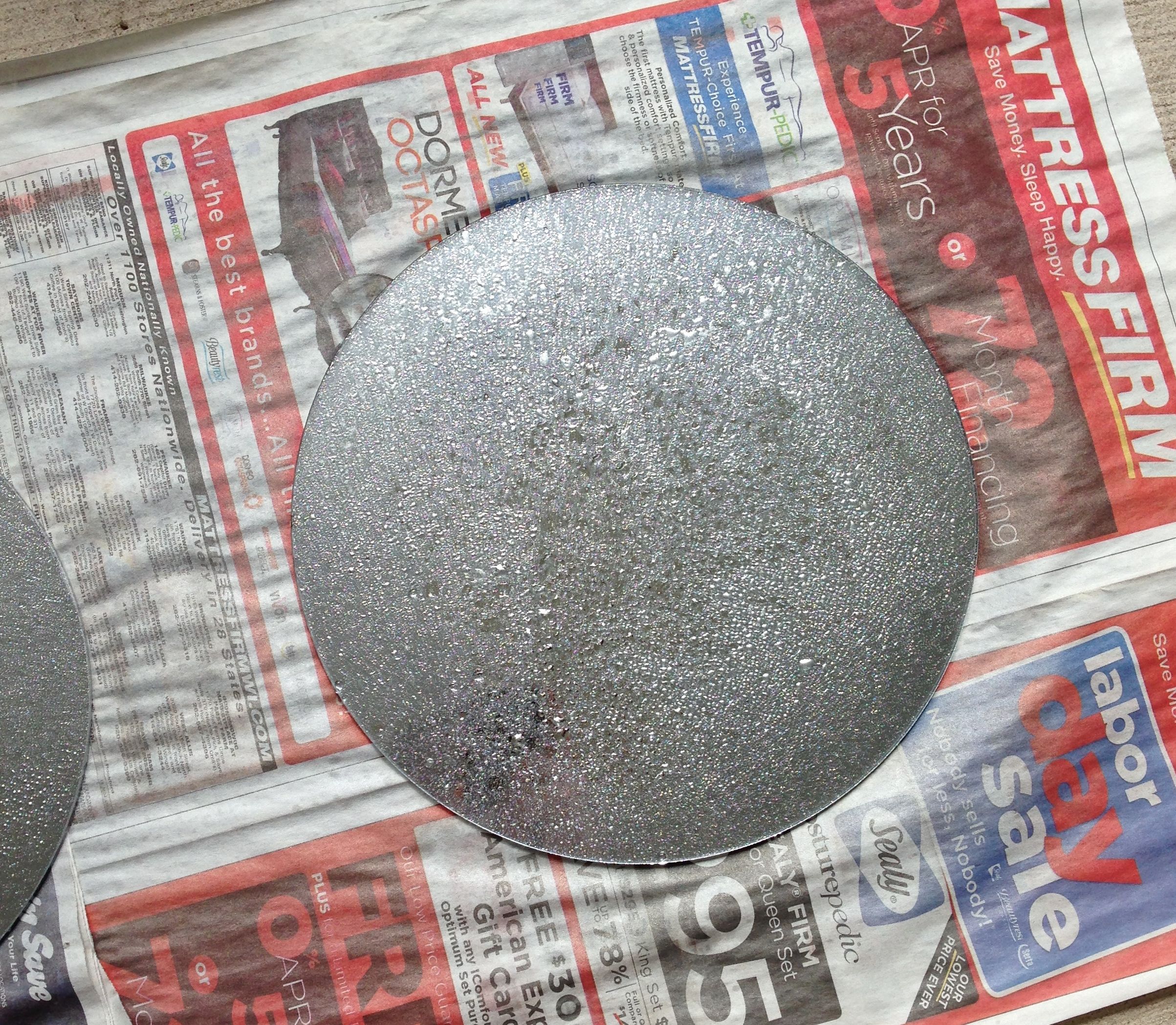 Luckily, this project took place when it was still warm because this stuff is smelly. I worked out on the front porch. First I cleaned each shelf, then I lightly sprayed with the vinegar/water mixture, and followed that with a light spray of the Looking Glass. I let it sit a few minutes, then I blotted gently with a paper towel. Then I sprayed even more lightly with the vinegar mixture and more heavily with the Looking Glass. It took a few more repetitions before I felt the glass looked suitably antiqued. I recommend using the layered approach—you can always add more patina, but it’s hard to get it off. I blotted one last time, let it air dry for a few hours, then very gently buffed it with a paper towel before I reassembled the stand.