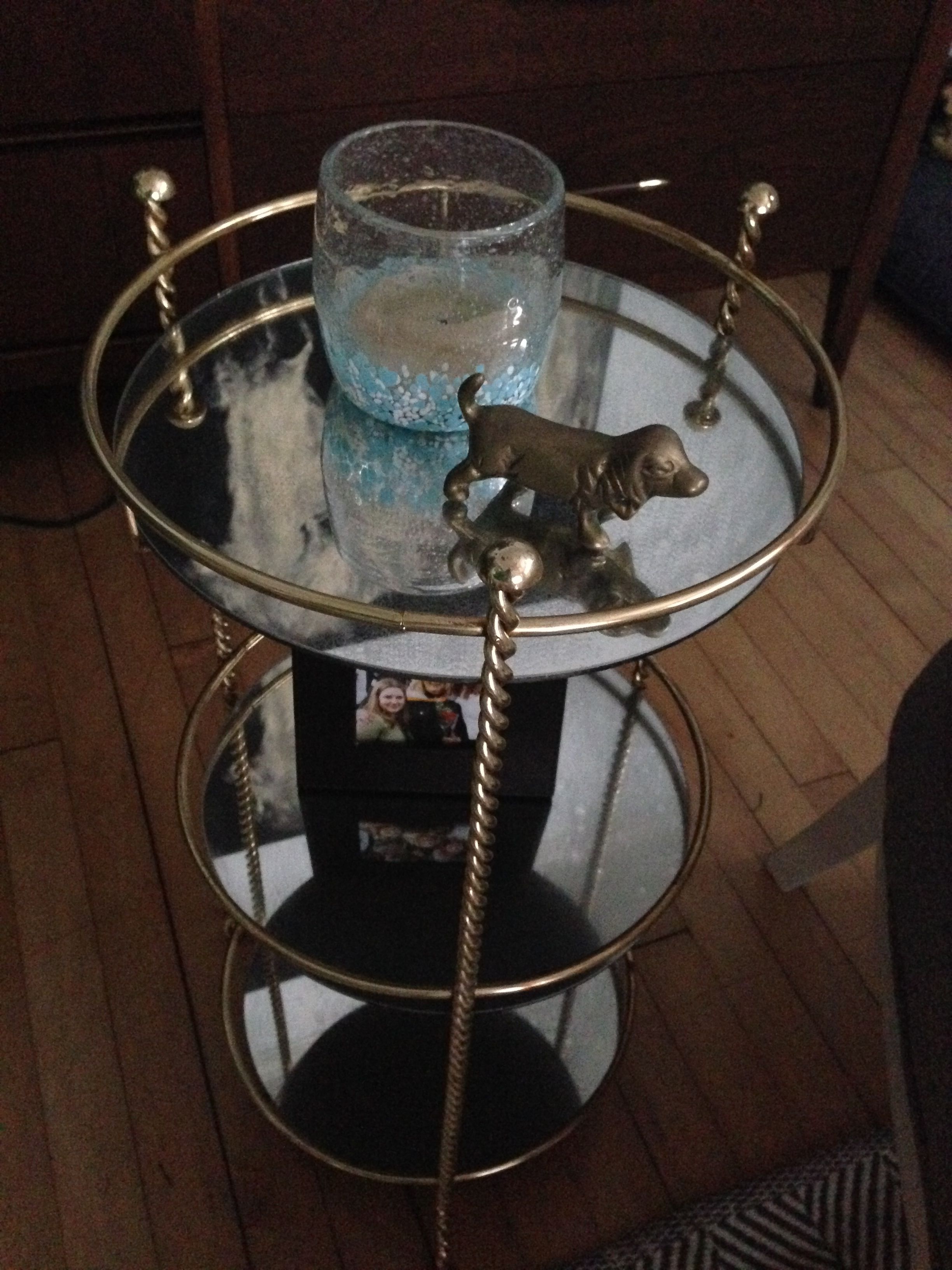 Voila! It’s not the antique bar cart of my dreams, but it’s a cute little table that’s perfect for holding a candle, picture, or drink. I love how the antiqued mirrors turned out. They’re mottled, but still pretty reflective (as you can see by the upside down horse head).