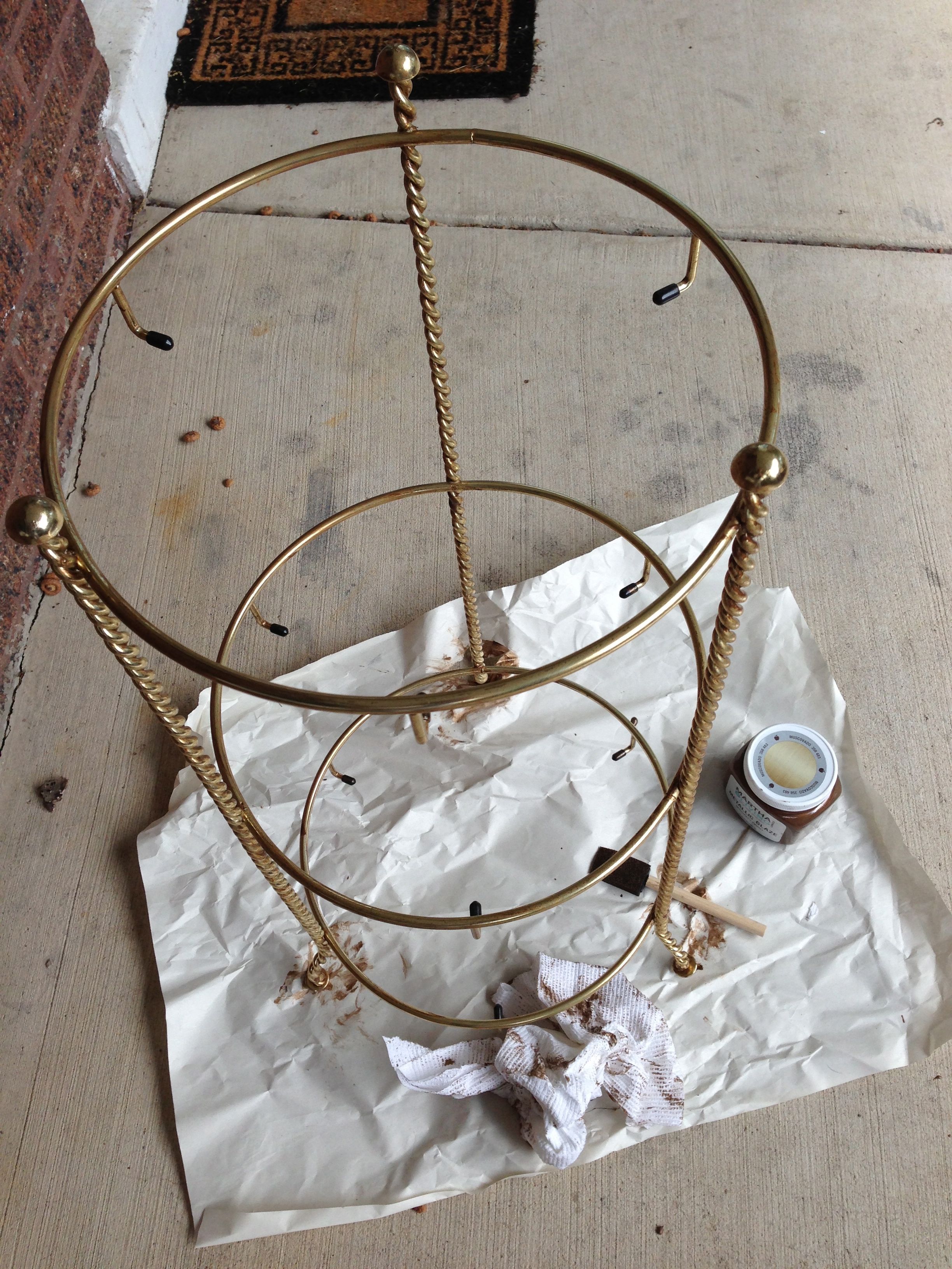 Another random Mom gift. She picked it up at a rummage sale. It kind of screamed 1980s plant stand. Or maybe something you’d put in a bathroom. In any case, it was bright and brassy in the most cheap-yellow way.  But, as with the lamp, Mom saw the potential hidden by the ugly and suggested I paint it or something.