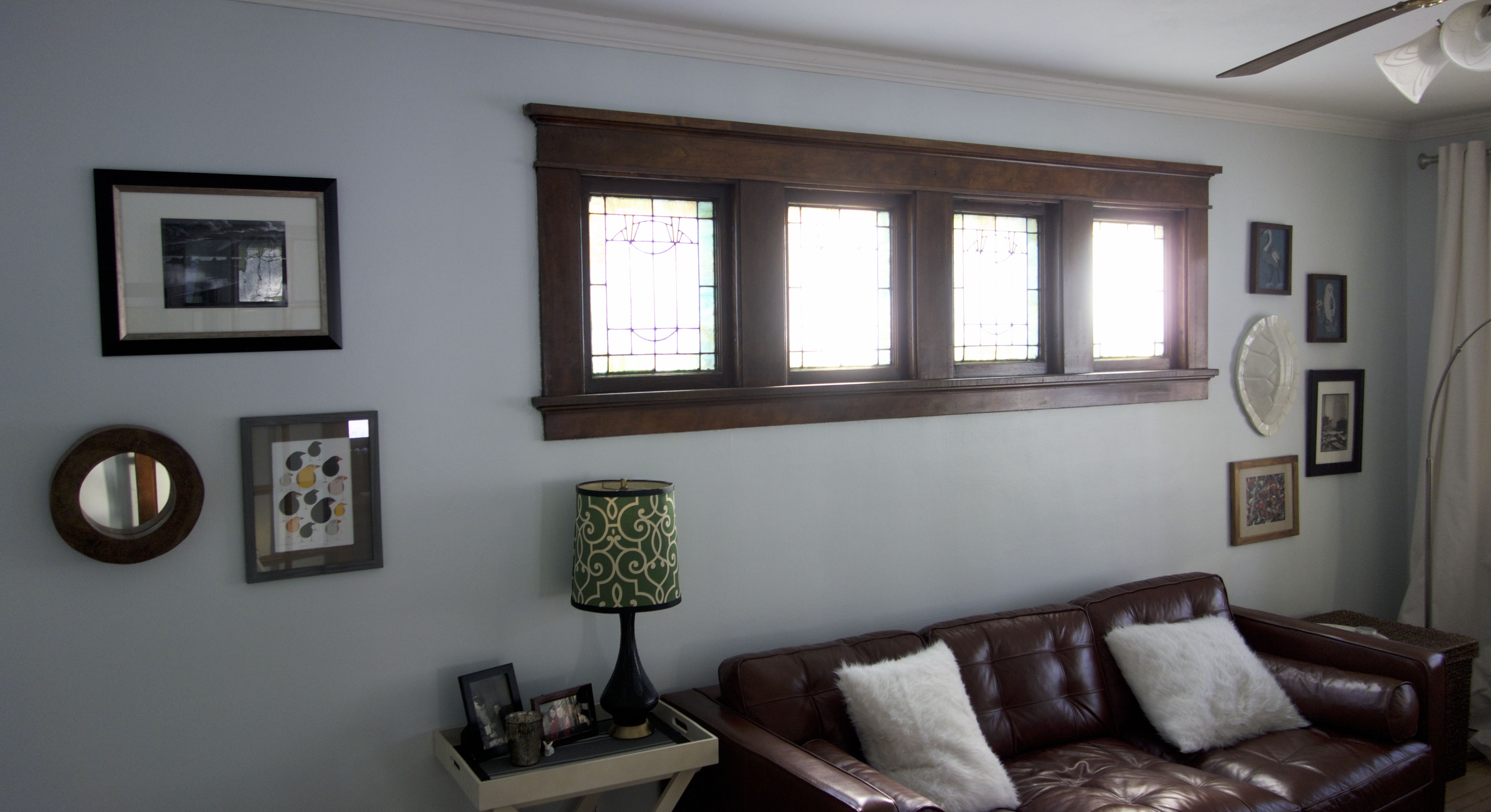 I really wanted to invest in the couch as my first piece of real, honest-to-goodness-grown-up furniture I picked out myself. I was 33. It was time. I went to JCPenny to look check out the gray fabric version of their Darrin couch and it turned out they were clearing out ALL the furniture. The floor models were going for insanely cheap (50% off list price, and this was when JCPenny was doing the no-sales, low price all the time thing). And suddenly, I had the opportunity to get a gorgeous, real-leather, mid-century style, ridiculously comfortable couch. A leather couch had previously been way, way, way outside my budget, but combined with the credit card deal they were running, I ended up paying $750 for a very high quality piece of furniture. I know that still seems like a lot of money to some people (it did to me – the couch is officially the most expensive thing I own aside from my car), but I think I’ll have this couch for a long long time. And I love it. More than one person can sit comfortably on it! I can stretch out and nap on it! People sit on it and comment how comfy it is. And the dog hair comes right off with a brush of the hand or a light vacuum. So, so happy with the couch. But it meant the brown paint on the walls and the wood trim was causing brown overload.