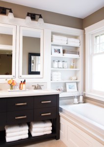 - The vanity will be dark with a light top, have an open shelf, and (hopefully!) two drawers and a cabinet