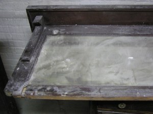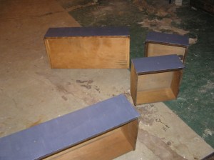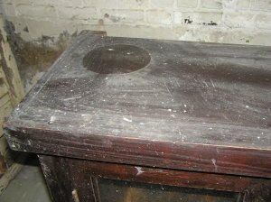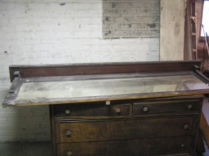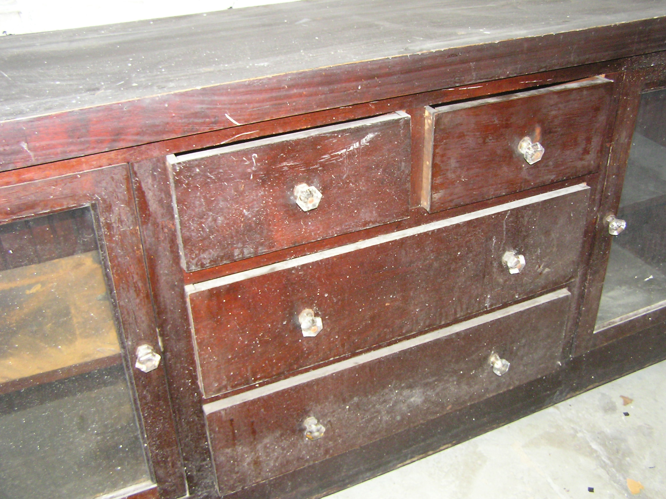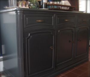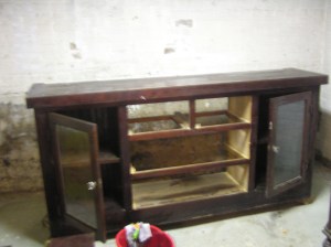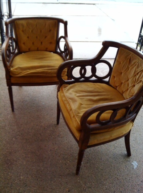 A dark room with sage green walls with a nice dented texture that you can see on the left. Since I was sticking with light gray for most of the rest of the apartment (Burnished metal in the foyer, dining room and back hall and French Silver in the bedroom), and this was one of the few rooms that was open, but separated from the other rooms by wood trim (the halls, kitchen and dining room all flow together with plaster archways), I thought it was an opportunity to add another color to the house. I know some people like to use one continuous color when rooms are open to each other, but I really like the effect of looking from one room to another and seeing a touch of something different – as long as it works together! (My disastrous interim kitchen color did not, which is a story for another blog entry.) With all the wood accents throughout the apartment, I thought brown would work really well and would make the room feel warm and snug. I’d planned to get a light gray couch, a gray patterned rug, a light-colored ottoman coffee table, and then I was finally going to recover those estate sale chairs in a light/neutral fabric and paint them white.